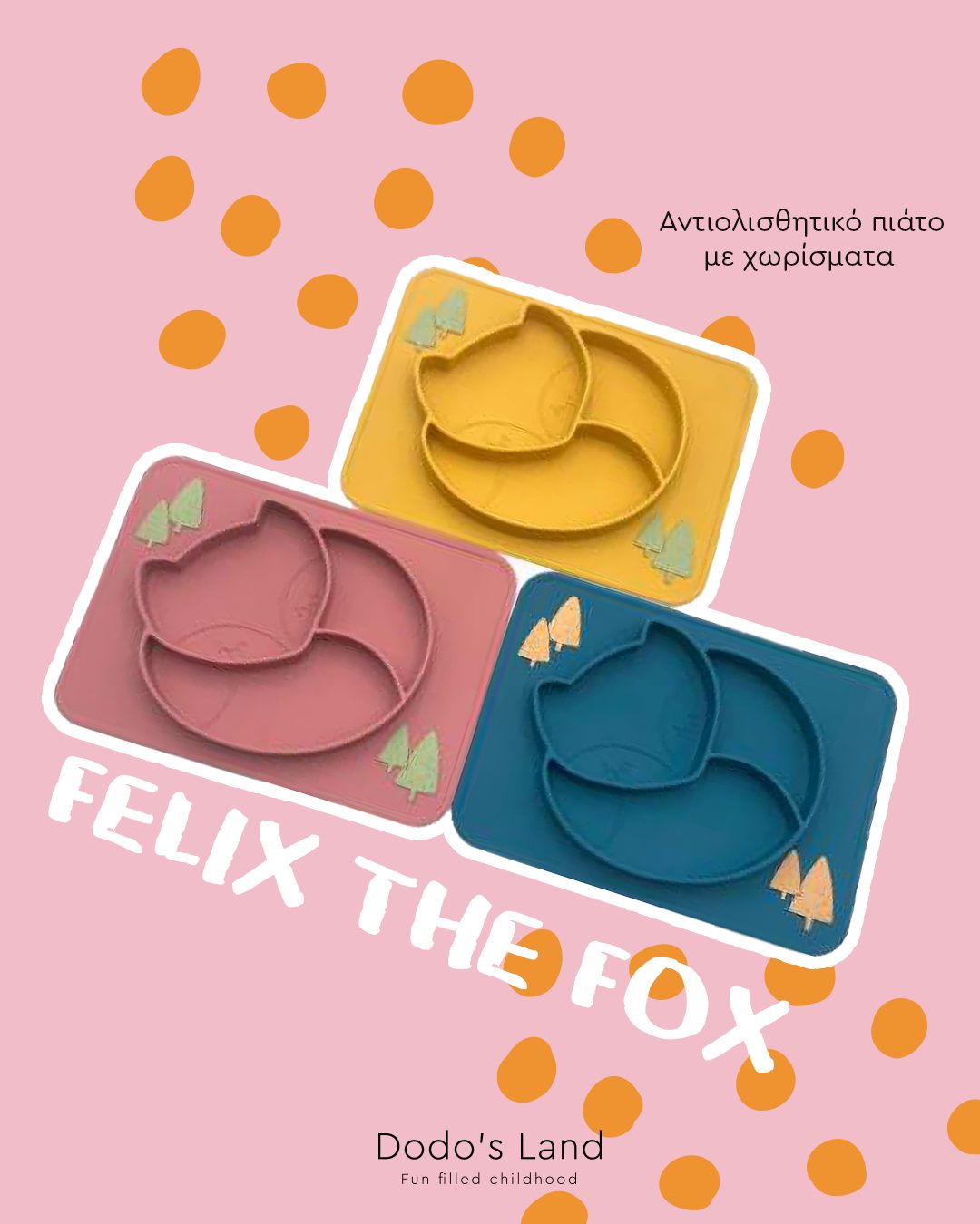 Το εργονομικά σχεδιασμένο αντιολισθητικό πιάτο Felix the Foxy έχει ένα υπέροχο σχήμα αλλά και 3 χωρίσματα , έτσι δίνει τη δυνατότητα στους γονείς να προσφέρουν διαφορετικές ομάδες τροφών με διαφορετικές υφές έτσι ώστε το παιδί να εξερευνήσει μόνο του το φαγητό του και να κάνει όλη την διαδικασία διασκεδαστική και ευχάριστη. Επίσης μπορεί να μετρήσει και τα δεντράκια και να ανακαλύψει τα 2 διαφορετικά χρώματα του πιάτου.